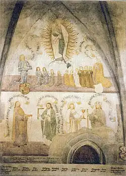 Freigelegt wurde jedoch ein relativ gut erhaltenes Votivgemälde an der nördlichen Chorwand über der Tür zur Sakristei, das wahrscheinlich nach 1515 entstanden ist und ein ganzes Gewölbejoch ausfüllt.[2] Es stellt den Grafen Bernhard III. zu Solms-Braunfels dar mit Gemahlin und Kindern, kniend unter einer Madonna (Muttergottes, Maria mit Kind). Im unteren Teil des Freskos sind die Apostel Jakobus der Jüngere, Thomas, Johannes und Jakobus der Ältere dargestellt mit ihren Attributen unter Spruchbändern, auf denen die den einzelnen Aposteln beigelegten Glaubenssätze stehen.