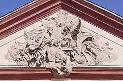 Das Giebelrelief über dem Eingang zeigt die Heilige Dreifaltigkeit und stammt vom Hofbildhauer Paul Egell, es ist eines seiner größten Reliefs.