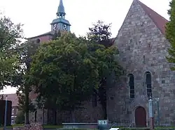 Der breite, gedrungen wirkende Turmbau wurde dem Kirchenschiff in der ersten Hälfte des 13. Jahrhunderts nachträglich als romanisches Westwerk mit einer Doppelturmanlage hinzugefügt, deren erstes Obergeschoss als Herrschaftsloge vorgesehen war; jedoch unterblieb die Öffnung des alten Westgiebels des Kirchenschiffs nach Westen. Um 1600 gingen die hölzernen Turmspitzen verloren, möglicherweise durch einen Sturm. Die verbliebenen Rümpfe wurden erst im 18. Jahrhundert zu der heutigen Form unter einem Dach zusammengefasst. Von 1775 bis 1986 war der Backstein verputzt und der Putz mit einer Quaderritzung versehen. Im Inneren und von Osten kann man noch die beiden Turmstümpfe erkennen, in denen die fünf Kirchenglocken läuten.[2] Der Unterbau der Turmanlage besteht aus der Eingangshalle (mit den beiden einzigen farbigen, modern gestalteten Glasfenstern) und der darüber liegenden Turmloge.