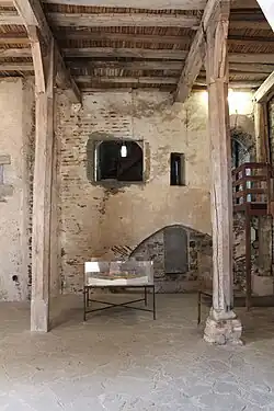 Die flache Holzbalkendecke der Katharinenkapelle wird von Unterzügen getragen, die seit 1688 auf achteckigen Pfosten mit Bügen ruhen. Sie dienen dazu, das Gewicht der Südempore und der Grabplatte unter dem Altartisch aufzunehmen.[19] Ursprünglich ruhte die Decke auf einem Mittelunterzug, dessen Konsolsteine noch zu sehen sind. Im westlichen Gemeindesaal und am Bogen sind Reste mittelalterlicher Fresken erhalten.[21]