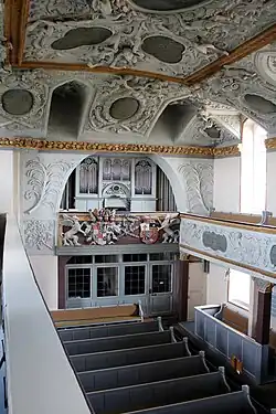 Der Innenraum der Barockkirche wird durch ausladendes Stuckwerk in edlem Weiß beherrscht, das Johannes de Paerni (Giovanni Bajerna) ab 1686 im Stil des italienischen Frühbarock schuf. Der ansonsten unbekannte Paerni entstammte vermutlich einer Künstlerfamilie aus Balerna in Tessin.[22] Prominent an der Südempore trägt eine Putte das Familienwappen der Paernas mit einem Inschriftenband des Stuckateurs: „IOVANNI DE PAERNI FECIT Ao: 1686“.[23] Als Material diente Stucco-Gips, der aus dem Segeberger Kalkberg, dem Harz oder Iphofen stammte, vor Ort erhitzt und mit gewaschenem Feinsand gemischt wurde.[24] Insgesamt sind 65 Engel und Putten dargestellt, die wehende Bänder und Blumengirlanden halten.[10] Die flachgewölbte Decke ist durch zwei umlaufende Friese gegliedert. Ein ockerfarbenes Karnisgesims aus mediterranen Früchten am Wandschluss hebt sich vom weißen Stuck ab. Ein weiterer, schlichter gestalteter, rechteckiger Akanthusfries bildet einen inneren Rahmen. Der Deckenstuck wird in Felder mit Rankenwerk, Muscheln, Vasen, Putten und Schriftmedaillons mit Bibelversen eingeteilt und hat perlstabförmig umrahmte Stichkappen für die Fenster.[17] Die Emporen an den Langseiten ruhen auf Rundsäulen mit Kapitellen aus Ranken und Voluten. An der Ostseite ist die Kanzel aufgestellt.[1] In der Deckenmitte wird ein ovaler Lorbeerkranz von vier geflügelten Putten gehalten. Die 18 Schriftfelder folgen einem theologischen Programm reformierter Prägung. Zentral stehen die Bibelverse aus Ps 16,10–11 mit der Verheißung unbegrenzter Freude, die von drei johannäischen Versen (Joh 3,16 , Joh 4,24 , 1 Joh 5,7 ) und einem Psalmvers (Ps 103,8 ) umgeben wird, die zentrale Aussagen über den dreieinigen Gott machen. Außen finden sich sechs Psalmverse mit weiteren Verheißungen (Ps 13,6 , Ps 55,17 , Ps 33,8 , Ps 33,18–19 , Ps 119,175 , Ps 27,13 ). Die sieben Verse aus den Evangelien und neutestamentlichen Briefen betreffen vor allem den christlichen Lebenswandel (1 Petr 2,12 , Jak 5,13 , Mt 18,19 , Jak 1,22 , Heb 12,6 , Heb 12,14 , Röm 3,28 ).[25]
