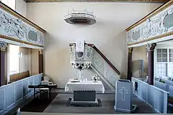 Das heute ebenerdige Obergeschoss des Turms ist ein separater Raum hinter dem Kirchenschiff, der den Zugang zur Loge auf der Westempore ermöglicht. Die Wand hat drei Fenster mit Sprossengliederung und eine oben verglaste Tür. Zentral an der Ostwand ist die stuckierte Kanzel aufgestellt. Der polygonale Kanzelkorb ruht auf einer schlanken Rundsäule, über dessen Kapitell fünf Putten als Atlanten den Kanzelkorb tragen. Auf den Feldern werden Medaillons entsprechend reformierter Tradition mit Bibelversen von Rankenwerk umgeben, das auch die Brüstung des Aufgangs verziert.[27] Der jüngere Schalldeckel hat einen flachgeschnitzten Aufsatz, der von kleinen Spitzen bekrönt wird. Das Kirchengestühl mit geschwungenen Wangen bildet einen Mittelblock. Weitere Bänke mit schlichten querrechteckigen kassettierten Füllungen in der Brüstung sind unter den Langemporen aufgestellt.
