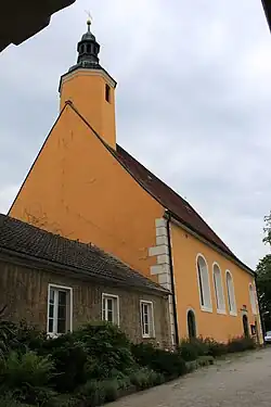 Hier ist das in seiner heutigen Form weitgehend im 17. Jahrhundert entstandene Bauwerk im Bereich des örtlichen Schlosses östlich des ebenfalls unter Denkmalschutz stehenden Torhauses zu finden, womit sie die westlichste Kirche auf dem Gebiet der Oberlausitz ist.[2][3]