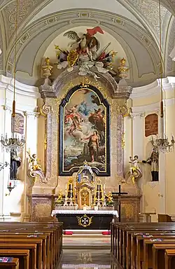 Das Kircheninnere zeigt sich als barocker zentralisierter Saalraum um 1751, das quadratische platzlgewölbte Hauptjoch steht zwischen je einem kürzeren Joch mit einer Stichkappentonne, das Ostjoch als Chor wird durch eine segmentbogenartige Apsisausrundung geschlossen.