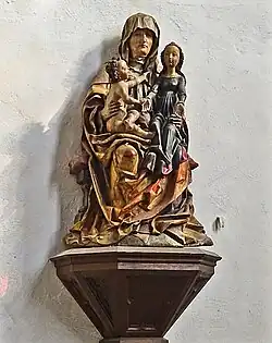 Im Schiff steht ein achteckiger, kelchförmiger Taufstein mit der Jahreszahl 1522 auf einer kreisförmigen Stufe, der am Becken mit spätgotischem Blendmaßwerk verziert ist. Ein überlebensgroßer Christus aus der Zeit um 1520 wurde 1907 restauriert und an die Nordwand versetzt. Er befand sich ursprünglich am Chorgitter und wird als „vorzügliches Werk der naturalistisch-expressiven Spätgotik“[2] gewürdigt. Weiter sind mehrere Schnitzfiguren unbekannter Herkunft aus der Zeit um 1520 zu erwähnen. Dazu zählen eine Maria auf der Mondsichel, eine Schmerzensmutter und ein heiliger Sebastian an den Emporen sowie ein Christophorus und eine Anna Selbdritt, welche 1907 dort aufgestellt wurden.