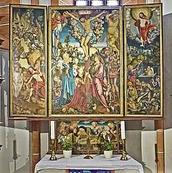 Die reiche Ausstattung im Stil der Spätgotik und der Frührenaissance stammt hauptsächlich aus den ersten Jahrzehnten des 16. Jahrhunderts. Hauptstück der Ausstattung ist ein großer Flügelaltar mit „sehr qualitätvoller, eigentümlich stilisierter“[2] Malerei aus dem Umkreis von Lucas Cranach dem Älteren, vermutlich von Hans Döring aus der Zeit um 1518/1520, der in den Jahren 1952–1955 und 1963 restauriert wurde. Auf der Mitteltafel ist die Kreuzigung Christi dargestellt, auf den Flügeln Christus in der Vorhölle und seine Auferstehung, in der Predella die Beweinung Christi und auf den Außenseiten der Flügel die Verkündigung an Maria.