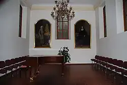 Im Chor befinden sich an der Ostseite zwei Gemälde des polnischen Porträtmalers Georg Lisiewski, der am Hof König Friedrich Wilhelms I. arbeitete, und Lisiewskis Tochter Barbara Rosina. Die Werke aus den Jahren 1739 und 1740 zeigen Severin Schindler (von G. Lisiewski) und seine Ehefrau Rosina (von B. Lisiewska).[2] An der nördlichen bzw. südlichen Chorwand hängen figürliche Grabsteine derer von Krummensee: An der Nordwand sind Wilhelm (gestorben 1585) und seine Ehefrau Elisabeth geborene von Ilow (gestorben 1613) zu sehen, während an der Südwand an Cristoffel (gestorben 1596) erinnert wird. Östlich dieses Epitaphs hängt eine Ahnentafel des Heinrich Wilhelm von Krummensee. Sie besteht aus Weißblech, auf das in Öl 20 Wappen aufgetragen wurden. Ein weiteres Grabdenkmal erinnert an den einstigen Eigentümer und Hofbankier Friedrichs II., Friedrich Wilhelm Schütze aus dem Jahr 1797: In einer Nische steht eine figürliche Darstellung der Hoffnung, die sich auf eine Urne stützt. Die übrigen Ausstattungsgegenstände gingen im Wesentlichen durch Kriegseinwirkungen verloren. Lediglich die Westempore ist noch vorhanden. Sie ist in einem rötlich-braunen Farbton gehalten und mittig mit einer Kartusche verziert.
