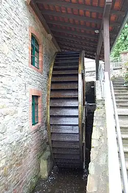 Das an der Außenseite befindliche Wasserrad hat einen Durchmesser von sechs Metern. Am Rad sind 60 Wasserkästen mit einem Fassungsvermögen von je 33 Litern angebracht. Das Rad macht etwa vier bis sechs Umdrehungen in der Minute. Die Leistung beträgt etwa 6 PS.