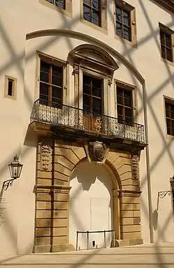 Das Portal ist ein Rundbogen in Rustika. Der große Schlussstein zeigt den Wahlspruch des Bauherrn Johann Georgs III. Der vorgelegte Rundbogen zeigt verkröpftes Gesims und wird zu beiden Seiten mit Festons geschmückt. Darüber befindet sich ein Gesims mit Balkon, der ein schmiedeeisernes Gitter als Brüstung hat. Zu diesem Balkon führt eine Tür flankiert von zwei Fenstern. Die Tür zeigt zu beiden Seiten eine schöne Fensterumrahmung mit Pilastern. Oberhalb des Fensters gibt es einen Segmentgiebel als Fensterverdachung.