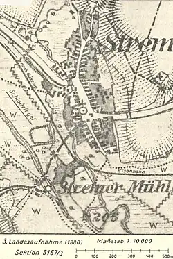 Bei der Kartografierung des Gebietes im Zuge der Franzisco-Josephinischen Landesaufnahme im Jahre 1880 wurde der Schlossriegel verzeichnet.[17] Laut Kartenbeilage bestand die die Anlage damals aus einem 90 × 75 m großen, viereckigen Plateau, das ungeschützt aus dem umgebenden Sumpfgebiet hervorragte.[18] Diese Wehranlagen wurden im Zuge des Baus der Güssinger Bahn und der Regulierung der Strem später stark beschädigt.[19] Im Laufe der darauffolgenden Jahrzehnte folgten durch Urbarisierungen wohl weitere Zerstörungen.[20]