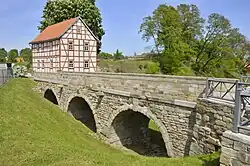 Der Zutritt zum Schloss erfolgt über eine wiederhergestellte dreibogige Steinbrücke über den Burggraben. Sie stammt aus der Zeit nach 1747 und überspannte einen Graben von 30 Metern Breite und sechs Metern Tiefe. Die Sanierungsarbeiten hierzu wurden 2004 abgeschlossen. 1958 wurde das Schloss, vermutlich aus politischen Gründen, abgerissen, lediglich das 1820 unmittelbar hinter dem äußeren Schlosstor als Fachwerkbau errichtete Amtshaus am inneren Brückenkopf blieb erhalten. Nach Abschluss der Sanierungsarbeiten soll es musealen Zwecken dienen.