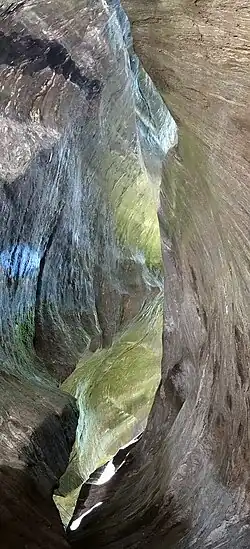 Die grüne Orrido Nord-Est hat eine Länge von etwa 100 m und ist bis 10 m tief, an einigen Stellen sehr eng.