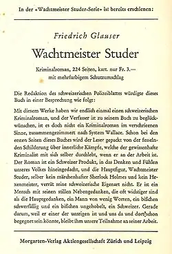 Kurz nachdem die ersten Folgen von Schlumpf Erwin Mord in der Zürcher Illustrierten erschienen waren, schrieb Friedrich Witz an Glauser: «Wo immer ich hinkomme, muss ich Auskunft über diesem Glauser geben und tönt mir, ohne dass ich es heraufbeschwöre, ein Loblied über den Roman entgegen.»[19] In den Zeitungen erschienen positive Rezensionen; so in der Gazette de Lausanne, der Neuen Zürcher Zeitung, der Basler National-Zeitung oder im Bund, der dazu schrieb: «Dieser Roman ragt weit über den Durchschnitt der sattsam bekannten ‹Kriminalliteratur›, ist vielmehr als nur ein atemlos fesselndes Rechenexempel nach vorbildlichem Schema. Glauser hat seinen Stoff auf eine künstlerische Ebene gehoben, die dem Vielschreiber Edgar Wallace ewig fern, aber auch einem Conan Doyle nur in seltenen Augenblicken erreichbar war. Ein Meister psychologischer Analyse, ist Glauser zugleich ein warm empfindender und herrlich beobachtender Dichter.»[20] Und in der Erstausgabe der Fieberkurve von 1938 wurde für Wachtmeister Studer damit geworben, dass sogar das Schweizerische Polizeiblatt den Roman unter anderem mit den Worten lobte: «Schon bei den ersten Seiten dieses Buches wird der Leser gepackt von der fesselnden Schilderung über innerliche Kämpfe, welche der gewissenhafte Kriminalist mit sich selbst durchlebt, wenn er an der Arbeit ist. (…) Er (Studer) ist ein Mensch mit seinen stillen Nebengedanken, die oft wichtiger sind als die Hauptgedanken, ein Mann von wenig Worten, ein bisschen schwerfällig und ein bisschen ungehobelt, ein Schweizer. Gerade darum, weil er einer der unsrigen ist und uns da und dort schon begegnet sein könnte, bleibt ihm unsere Teilnahme an seiner Arbeit.»