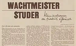 Die Premiere von Wachtmeister Studer fand am 13. Oktober 1939 im Kino «Urban» in Zürich statt. Im Vorspann des 105 Minuten langen Filmes stand: «Nach dem in der Zürcher Illustrierten erschienenen Roman von Friedrich Glauser. Als Buch im Morgarten-Verlag.» Robert Walser schrieb dazu: «Nicht wahr, das ist wieder ein Erfolg im Kino, der Wachtmeister Studer von Glauser, der ihn leider nicht mehr mit hat erleben wollen, weil er vielleicht an keinen mehr geglaubt hat. So geht’s oft im Leben, dass solche Helden werden, die zu bescheiden sind, um sich eine derartige Rolle zuzutrauen.»[33]