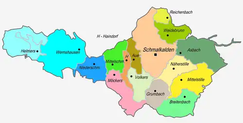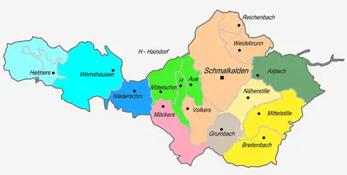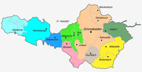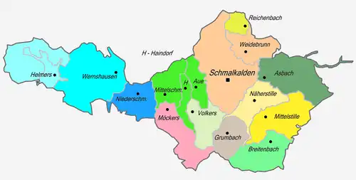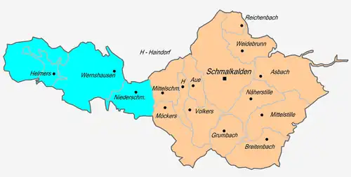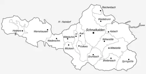 | Lage der Stadt Schmalkalden im Landkreis Schmalkalden-Meiningen | ||