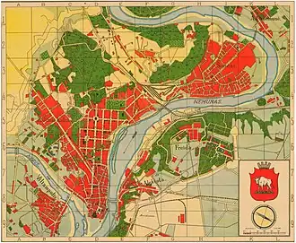 - ↑ Vom Depot in Žemoji Freda erreichte die Schmalspurbahn über die Aleksotas-Brücke den zentralen Teil der Stadt. Ein Zweig der Strecke verlief dann auch entlang der heutigen Daukša-Straße in Richtung des Benediktinerklosters. Es ist wahrscheinlich, dass dieser Zweig Teil der erhaltenen Schmalspurbahn nach Vilijampolė war, die in den 1920er Jahren verlegt wurde. Die Kreuzungen der "Siauruks"-Linie befanden sich auf dem Nemunas-Damm an der heutigen L.-Zamenhof-Straße, der S.-Daukanto-Straße, an der M.-K.-Čiurlionio-Straße und an der heutigen Juozapavičiaus-Allee an der Kreuzung mit der Sodų-Straße (bei der damaligen "Metalo"-Fabrik). Auf dem Stadtplan sind die noch nicht abgebauten Eisenbahnstrecken der ehemaligen Festung in Aleksotas, Aukštoji Freda, eingezeichnet.