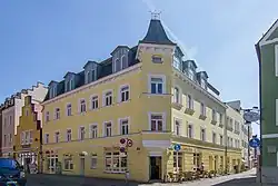 Das dreigeschossiges Eckhaus mit Mansardwalmdach und Eckerker stammt von Otto Abe aus dem Jahr 1897 unter Zusammenfassung dreier Vorgängerbauten. Jahrelang stand das Denkmal leer und wurde in den 2000er Jahren vom örtlichen Architekten und Denkmalpfleger Andreas Mühlbauer saniert.[1] Im Sockelgeschoss des Mietshauses befinden sich seitdem Läden und in den Etagen darüber Wohnungen.