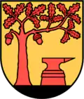 Das Wappen zeigt eine rote asymmetrische Eiche mit einem großen mit zwei Eicheln und Eichenblättern behangenen Ast über einem roten Amboss auf einem goldenen Schild mit schwarzem Schildfuß. Der Amboss symbolisiert eine Schmiede und gibt somit den Ortsnamen als „Schmiedestätte“ wieder. Die Farbgebung Rot-Gold weist auf die jahrhundertelange Zugehörigkeit (bis 1802) zum ehemaligen Hochstift Hildesheim hin. Der Baum stellt die sogenannte „Muttereiche“ dar, die in ihrem realen Vorbild einen Stammumfang von fünfeinhalb Metern aufweist.