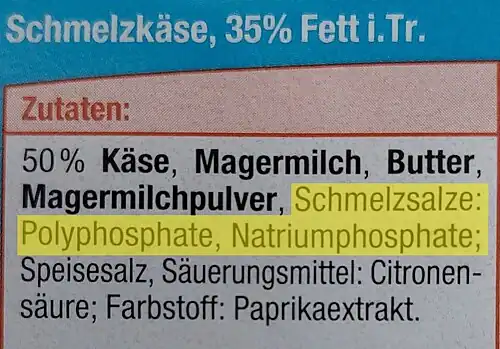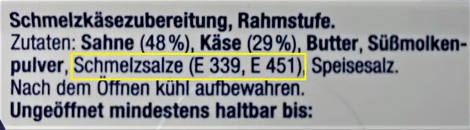 - ↑ a b c Eintrag zu Schmelzsalze In: Lexikon der Lebensmittelzusatzstoffe: Zusatzstoffe im Essen. Frank Massholder, abgerufen am 20. April 2022.