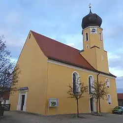 Die Saalkirche wurde 1715 erbaut. Sie besteht aus einem quadratischen Langhaus, einem eingezogenen, lang gestreckten Chor im Osten und einem Kirchturm auf quadratischem Grundriss, der mit der Südwand des Langhauses fluchtet. Das oberste, achteckige Geschoss des Kirchturms beherbergt die Turmuhr und den Glockenstuhl, in dem drei Kirchenglocken hängen.[1] Darauf sitzt eine Zwiebelhaube.
