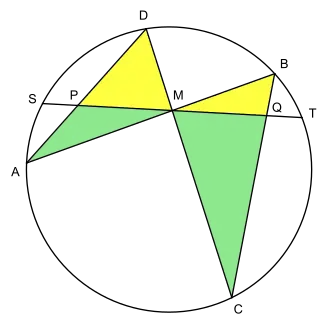 - Gegeben sei ein Kreis mit einer Sehne . sei der Mittelpunkt dieser Sehne. und seien zwei weitere Kreissehnen, die ebenfalls durch gehen. Dabei sollen und auf derselben Seite von liegen. und seien die Schnittpunkte der Kreissehnen bzw. mit .