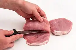 Dabei wird eine quer zur Faser geschnittene Fleischscheibe von der doppelt gewünschten Stärke auf eine harte Unterlage gelegt, mit der flachen Hand von oben festgehalten und mit einem sehr scharfen Messer waagerecht in zwei gleich dünne Scheiben zerteilt, so dass sie an einer Seite miteinander verbunden bleibt. An dieser Seite wird von außen ein nur wenige Millimeter tiefer Schnitt entgegengesetzt. Nun kann das Fleischstück zu doppelter Größe auseinandergefaltet werden. Meist wird es anschließend leicht mit dem Fleischklopfer plattiert.[1]