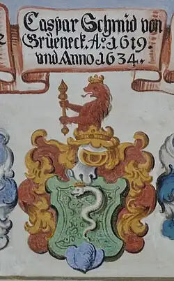 1544 wurde die Familie von Kaiser Karl V. in den Adelsstand erhoben und durfte das Prädikat «von Grüneck» tragen nach der gleichnamigen Burg, die allerdings schon damals Ruine war. Die Schmid führten in ihrem Wappen eine aufrechte Schlange, das Berufssymbol der Schmiede.
