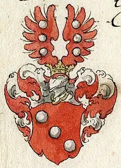 Blasonierung des Wappens von 1600: In Rot drei schrägrechts übereinander gestellte silberne Kugeln. Auf dem gekrönten Helm mit rot-silbernen Helmdecken ein offener roter Flug, jeder Flügel mit drei silbernen pfahlweise gestellten Kugeln belegt.