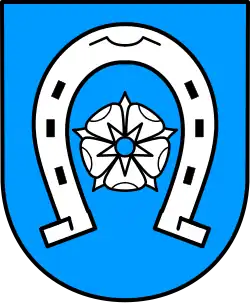 Blasonierung: „In Blau ein silbernes Hufeisen mit abwärts gekehrten Stollen, mitten darin eine silberne Rose mit blauen Butzen.“[11] |