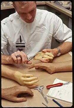 Als Material benutzte man harzgetränktes Baumwollgewebe. Später verwendete man zunehmend Eisenblech, welches später von Aluminium und Leichtmetallen abgelöst wurde. Jedoch bereitete das Gewicht fortlaufend größere Probleme, daher griff man ab dem 19. Jahrhundert auch zu Holzarten wie Buchsbaum, Spillbaum, Ahorn-, Linden- und Zirbelholz. Jedoch gab es in dem Bereich der Schmuckhände selbst nur wenig Entwicklung, da man sich hauptsächlich mit dem Aspekt der Gewichtsreduzierung beschäftigte. Vereinzelt wird bei Teilprothesen (zum Beispiel einzelnen Fingern) auch Silikon verwendet.
