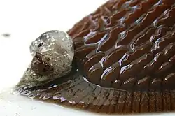 Während die Fortbewegung bei kleinen Wasserschnecken auf einem Wimperteppich stattfindet, kriechen die größeren und vor allem die landlebenden Arten auf einem Schleimteppich. Hierfür sondern Drüsen am vorderen Kopfende Schleim ab, über den sie mit raupenartigen Bewegungen der Sohle kriechen. Der Schleim besteht aus Polysacchariden und Proteinen und ist strukturviskos.[4] Das bedeutet, dass der Schleim bei geringen Dehnungen elastisch ist und bei höheren Dehnungen flüssig wird, was anhand des Schleimes der Bananenschnecke (Ariolimax columbianus) untersucht worden ist.[5] Es wurde festgestellt, dass der Schleim dehnungsabhängig zwischen einem viskoelastischen Zustand mit einem Schermodul von 100…300 Pa und einer Flüssigkeit mit einer Viskosität von 30…50 poise wechselt. Die verschiedenen Strukturzustände der Schleimschicht wandern wellenförmig unter der Schnecke, indem sie Teile des Fußes vorschiebt. Schnecken können aufgrund dessen sogar an glatten Flächen emporsteigen.