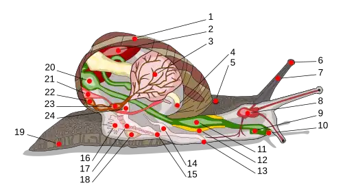 Der weiche Körper einer Schnecke besteht aus Kopf und Fuß (zusammen als Kopffuß bezeichnet) sowie dem rückenliegenden (dorsalen) Eingeweidesack, der von der Gewebeschicht des Mantels geschützt wird.