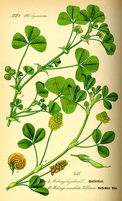 Illustration zweier Medicago-Arten: unten Hopfen-Schneckenklee (Medicago lupulina) und oben Arabischer Schneckenklee (Medicago arabica) | ||||||||||||