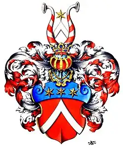 Geviertet. 1 und 4 in Gold ein goldgekrönter rotbezungter schwarzer Adler am Spalt. 2 und 3 in Rot ein silberner Sparren, am Schildeshaupt ein grau-blauer Balken mit drei sechszackigen goldenen Sternen. - Auf den zwei Helmen, rechts mit schwarz-goldenen Decken, ein goldgekrönter rotbezungter schwarzer Adler und links mit rot-silbernen Decken zwischen zwei von rot und silber eingebundenen Büffelhörnern, der Sparren auf dessen Spitze ein goldener sechszackiger Stern ruht.