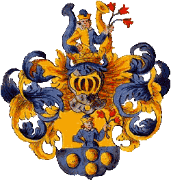 Ein von Gold und Blau geteilter Schild; oben ein blaugekleideter bärtiger Mann mit goldenen Knöpfen und ebensolcher Bauchbinde wachsend, auf dem Kopf eine blaue Spitzkappe mit goldener Stulp, in der Linken drei Tulpen haltend, die Rechte in der Hüfte gestützt. Unten vier (1, 2, 1) goldene Kugeln. Auf dem Helm mit beiderseits blau-goldenen Decken zwischen zwei nach außen gerichteten, links goldenen, rechts blauen Büffelhörnern der Mann mit den drei Tulpen in von gold und blau längsgespaltenen Rock.