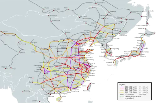 - High-speed Railway (HSR): National finanzierte Neubaustrecken, in der Regel für 350 km/h ausgelegte