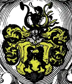 Das Adelswappen (1697) zeigt im Schild wie das Stammwappen, allerdings mit rotem Dreiberg, zusätzlich ein blaues Schildhaupt, belegt mit drei (2:1) goldenen Kugeln. Auf dem bekrönten Helm die Bracke wie beim Stammwappen, allerdings zwischen einem offenen Flug, rechts golden-rot, links blau-golden geteilt.
