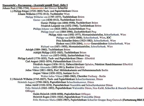 | Gebr. Schoeller k. k. Feintuch- und Wollwarenfabrik, Brünn | wurde gegründet durch die Brüder Johann Peter, Carl Friedrich und Heinrich Leopold Schoeller mit Genehmigung von Kaiser Franz I. von Österreich am 19. März 1819. Da die Brüder aber weiterhin hauptsächlich in ihren Dürener Werken tätig sein wollten, übertrugen sie das Unternehmen an ihren Neffen Philipp Wilhelm von Schoeller, welches anschließend bis zur Enteignung 1945 im Familienbesitz blieb.[21] | |