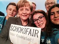 Zudem solidarisieren sich zahlreiche Prominente mit den Forderungen von SchokoFair, unter ihnen Richard Gere[12], Bundeskanzlerin Angela Merkel[13], Helmut Schmidt[14], Bundes-Entwicklungsminister Gerd Müller[15], Dirk Nowitzki[16], Anke Engelke[17], Joachim Król[18], Ben[19], Willi Weitzel[20], Mehmet Kurtuluş[21], Moritz Zielke[22], Eckart von Hirschhausen, Thomas Geisel und Bundesjustizministerin Katarina Barley.[23]