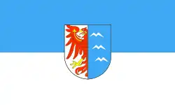 Die Flagge ist Blau - Weiß (1:1) gestreift mit dem aufgelegten Gemeindewappen.