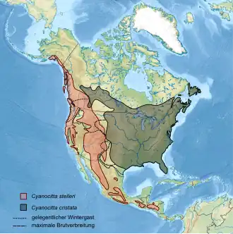 Die Schopfhäher sind im gesamten gemäßigten Nordamerika verbreitet und werden durch die nordamerikanischen Kordilleren voneinander getrennt. Das heutige Verbreitungsmuster ist wahrscheinlich ein Ergebnis der Vergletscherung großer Teile Nordamerikas während der letzten Kaltzeiten. Während der Blauhäher im eher flachen Ostteil des Kontinents bis zu den Rocky Mountains vorkommt, lebt der Diademhäher parapatrisch zu ihm in den westlichen Gebirgen und den angrenzenden gemäßigten und bergigeren Regionen. Lediglich im südwestlichen Kanada kommen Blau- und Diademhäher regional sympatrisch vor. Beide Arten stoßen bis an die Nordgrenze der warmgemäßigten Zone in Kanada und Alaska vor. Sie fehlen jeweils in den ariden Wüsten, Tälern und Küstenregionen des westlichen Kontinents. Nach Süden hin wird das Verbreitungsgebiet fragmentierter. Nur der Diademhäher stößt in die Tropen vor, bewohnt dort aber auch nur die kühleren Gebirgsregionen. Seine südliche Verbreitungsgrenze stellt das Tiefland von Nicaragua dar. [1][2] Im Pleistozän wurde er wahrscheinlich in verschiedenen, eisfreien Wärmeinseln im Süden und Westen isoliert und drang nach dem Abschmelzen der Gletscher bis in die Rocky Mountains vor.[4]