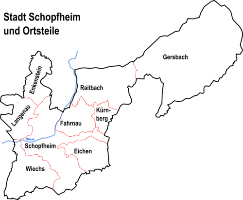 Unter den zugehörigen Wohnplätzen sind auch aufgegangene Orte aufgeführt, d. h. Orte die inzwischen voll in die übergeordneten Dörfer/Städte integriert sind und nicht mehr als eigenständige Siedlungen wahrgenommen werden (z. B. Gündenhausen (1841 eingemeindet)[29] und Höfen auf der Gemarkung der Kernstadt Schopfheim). Neben den aufgegangenen Orten gibt es abgegangene Orte (= Wüstungen), d. h. ehemalige Wohnplätze die physisch nicht mehr vorhanden sind und teilweise auch nicht mehr genau lokalisiert werden können.