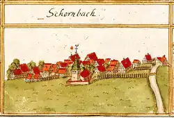 Im Jahr 1264 gab Graf Ulrich I. von Württemberg einige Grundstücke in Schornbach dem Kloster Adelberg in Zahlung. Die Urkunde über dieses Geschäft erwähnt erstmals den Ortsnamen.[2] Auch das Kloster Lorch besaß Güter vor Ort, die Graf Eberhard der Erlauchte 1293 unter württembergischen Schutz stellte, wobei zwischen Ober- und Unter-Schornbach unterschieden wurde. Schornbach war eine landwirtschaftlich geprägte, arme Gemeinde, deren Haupterwerb der Acker- und Weinbau darstellte. Während 1853 noch 96 Morgen zum Weinbau genutzt worden waren, wurde dieser – nach der Reblauskatastrophe – Anfang des 20. Jahrhunderts vor allem durch Obstbau ersetzt.