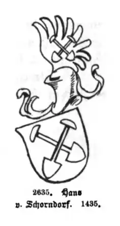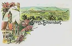 Die erste schriftliche Erwähnung des Ortsnamens stammt aus dem Jahr 1235. In einer Urkunde, laut der ein Heinrich von Waldhausen und seine Frau Grundstücke in Urbach und Hülben an das Kloster Lorch gegen zwei lebenslängliche Pfründen übertragen, wird als Zeuge neben Anderen ein „Dietericus de Shorendorf“ aufgeführt.[14] Derselbe taucht als „Dieterico de Sordorf“ in einer weiteren Urkunde des Klosters Adelberg von 1236 wiederum als Zeuge auf. Diesmal wird er als „ministerialis imperii“, also als (staufischer) Reichsdienstmann bezeichnet.[15] Als dessen Dienstsitz (Ministerialenburg) wird der Vorgängerbau des heutigen Schlosses angenommen.
