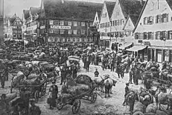 1707 wurde die Stadt von den Franzosen belagert und eingenommen.[28] Nach der Brandkatastrophe von 1743[29] wurde die Stadt in landestypischer Fachwerkbauweise neu errichtet. 1759 wurde das Amt Schorndorf zum Oberamt erhoben. Im Jahre 1806, als das Königreich Württemberg entstand, wurde im Zuge einer Neuorganisation das Oberamt Schorndorf durch Abgabe einiger Gemeinden an die Nachbarämter verkleinert. In den Jahren von 1811 bis 1880 wurden die Festungsmauern und Wälle um Schorndorf nahezu vollständig abgerissen. Am 17. März 1834 kam Gottlieb Daimler, der Erfinder des ersten schnelllaufenden leichten Benzinmotors, in der Höllgasse zur Welt. 1861 wurde die Remstalbahn eröffnet und Schorndorf somit Bahnstation im Netz der Württembergischen Eisenbahn. Im Jahre 1896 erfolgte der Anschluss an eine zeitgemäße Versorgung mit fließendem Wasser und 1899 ging das Elektrizitätswerk in Betrieb.