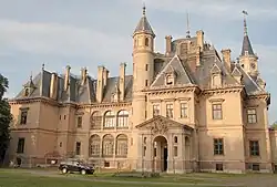 Das Schloss im Stil der französischen Neorenaissance wurde für den Baron Sigmund von Schossberger nach Plänen des Architekten Gyula Bukovics, einem Schüler von Miklós Ybl erbaut. Das zweigeschossige Herrenhaus besitzt eine quadratische Kuppel und einen linken Flügel mit Palmenhaus. Bemerkenswert sind die zylindrischen Türme sowie die halbkreisförmige Arkadenzone, welche den oberen Terrassen folgt.