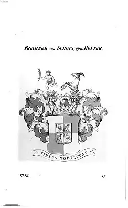 Johann Friedrich Carl Schott von Schottenstein (1737–1789) aus dem nassauischen Zweig, fürstlich nassau-usingischer Oberjägermeister, heiratete 1770 Marie Susanne Elisabeth Freiin von Hopffer und nahm deren Familiennamen zu seinem hinzu und gelangte in den Besitz des von den Hopffer rührenden Familienfideikommisses Rittergut Bläsiberg im Oberamt Tübingen.[1]