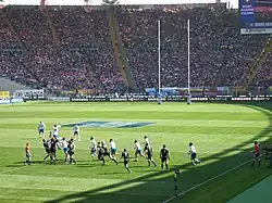 England revanchierte sich im folgenden Jahr im Londoner Kennington Oval und gewann mit 2:1 Toren. Diese frühen Spiele besaßen noch kein festes Punkteregelwerk; dies sollte erst 1890 eingeführt werden, nachdem ein geeignetes Format für das Bewertungssystem entworfen wurde.[16] Bis 1875 wurden – wie im Fußball – Test Matches durch die Anzahl erzielter Tore entschieden (Erhöhungen und Dropgoals), ab 1876 zog man die Anzahl gelegter Versuche heran, wenn ein Spiel Unentschieden verlief.[17] Wie es damals üblich war, umfassten beide Mannschaften je 20 Spieler, da die Anzahl Spieler pro Mannschaft während eines Spieles erst 1877 auf die seither üblichen 15 reduziert wurde.[18]