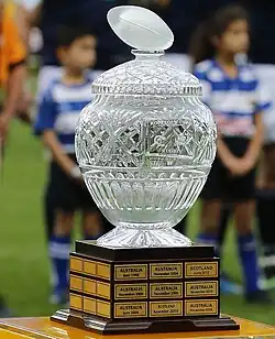Mitglieder des kurzlebigen Calcutta Rugby Club in der indischen Stadt Kalkutta übergaben 1878 der RFU einen Pokal. Nachdem der Verein seine Selbstauflösung beschlossen hatte, war das aus Silberrupien bestehende Vereinsvermögen von der Bank abgehoben und geschmolzen worden. Der auf diese Weise entstandene Pokal ist dahingehend einmalig, dass nur England und Schottland um die Trophäe spielen; es handelt sich um die älteste Trophäe im Rugbysport. Erstmals ausgespielt wurde der Calcutta Cup im Jahr 1879 in Edinburgh (das Spiel endete unentschieden). England eroberte den Pokal erstmals 1880, Schottland zwei Jahre später.[20]