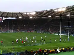 Das Five-Nations-Turnier 1972 musste wegen des Nordirlandkonfliktes vorzeitig beendet werden, sodass es keinen Sieger gab. Nach dem Blutsonntag in Derry war die britische Botschaft in Dublin von einem aufgebrachten Mob niedergebrannt worden und zahlreiche Spieler hatten Briefe mit Todesdrohungen erhalten, vermutlich von der IRA. Schottland und Wales weigerten sich, zu den noch bevorstehenden Auswärtsspielen in Irland anzutreten und begründeten dies mit der mangelnden Sicherheit.[40] Die Five Nations 1973 endeten zwischen allen fünf teilnehmenden Mannschaften gleichauf, ein einmaliges Ergebnis in der Geschichte des Turniers. Am 1. März 1975 besiegte Schottland beim Five Nations 1975 Wales mit 12:10, vor 104.000 Zuschauern im Murrayfield Stadium. Die Zuschauermenge war damals ein neuer Weltrekord für ein Rugbyspiel und ist noch immer der Stadionrekord.[41][42] Dieser Sieg war Teil einer Serie von neun aufeinanderfolgenden Siegen für die schottische Nationalmannschaft im Murrayfield Mitte der 1970er Jahre; dem gegenüber steht lediglich ein einziger Auswärtssieg in diesem Zeitraum.[43]